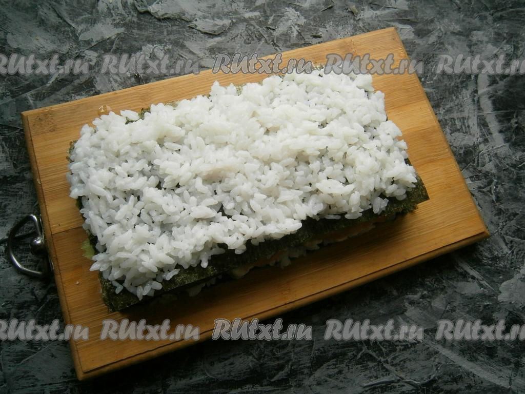 Мокрыми руками на лист нори выложить стакан готового риса, распределить его по всему листу.