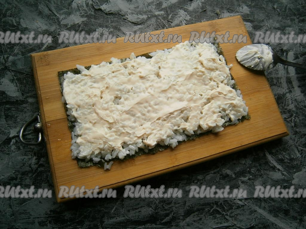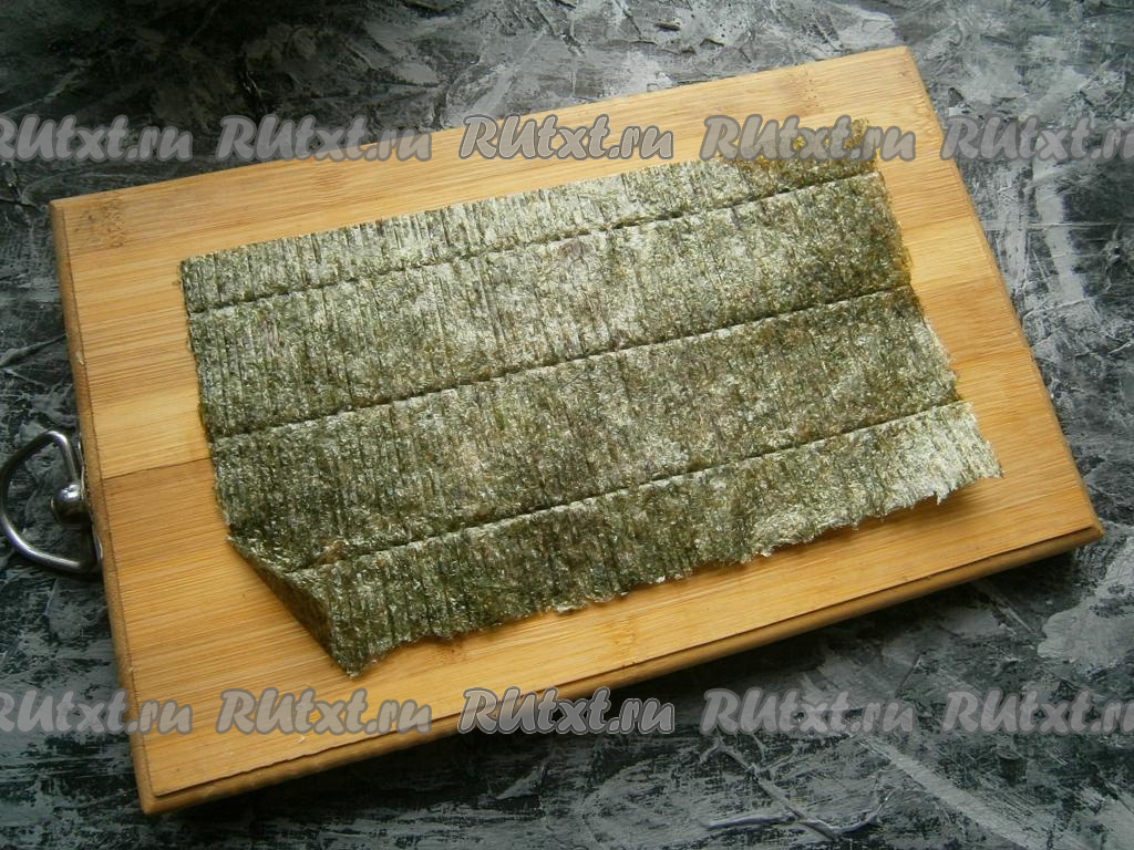 Лист нори выложить на досочку (или прямоугольное блюдо) шершавой стороной кверху.