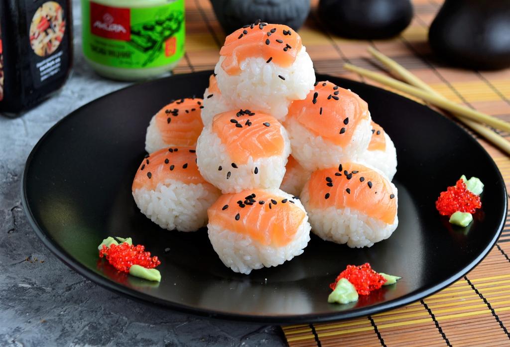 Таким же образом сформировать все шарики из риса и семги, выложить их на тарелку в виде пирамиды. Посыпать суши "Темари" сверху черным кунжутом.