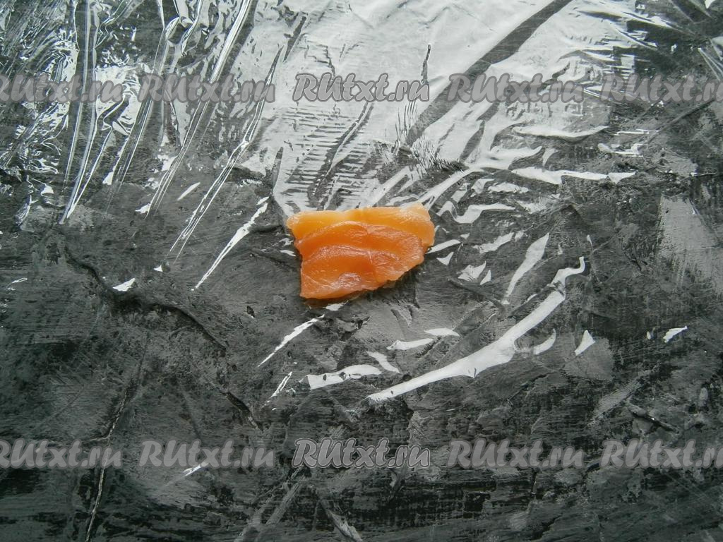 Семгу нужно нарезать на нетолстые кусочки размером, приблизительно, 2х4 см. Отрезать кусок пищевой пленки размером 25х25 см, разместить ее ровненько на поверхности стола, в центр пленки выложить кусочек семги.