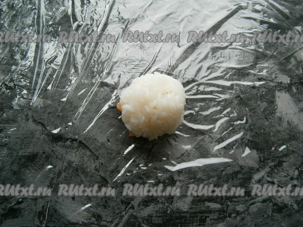 Аккуратно, чтобы рисовый шарик не сдвинулся, собрать края пленки кверху и закрутить их. Закручивать нужно плотно и крепко, чтобы шарик риса приобрел правильную круглую форму.