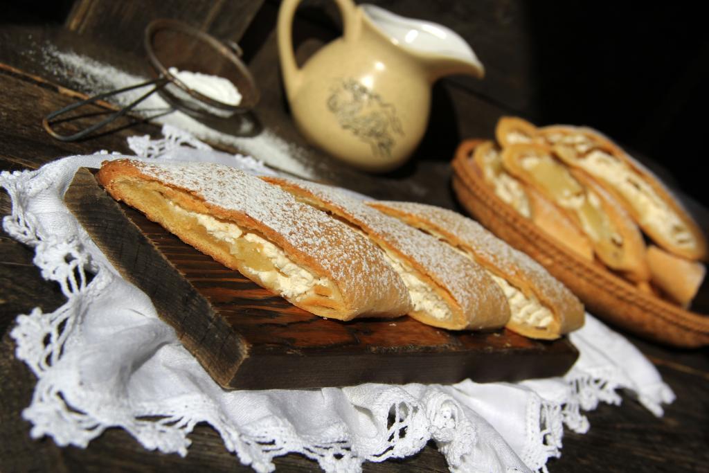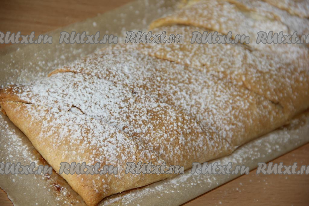 Переложить заготовки на разделочную доску, дать немного остыть, нарезать наискосок на длинные полоски. Присыпать пудрой и полностью остудить.