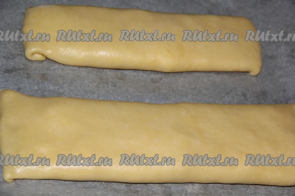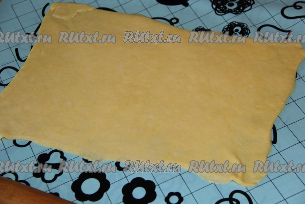 Тесто разделить на две равные части. Каждую часть теста раскатать в прямоугольный пласт. У нас получится два пласта.