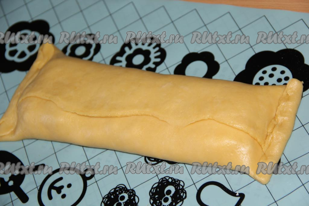 Края теста завернуть с двух сторон, накрывая творожную начинку. Немного подвернуть оставшиеся края теста и хорошо скрепить (как на фото). Аналогично из теста сформировать вторую заготовку с творожной начинкой.