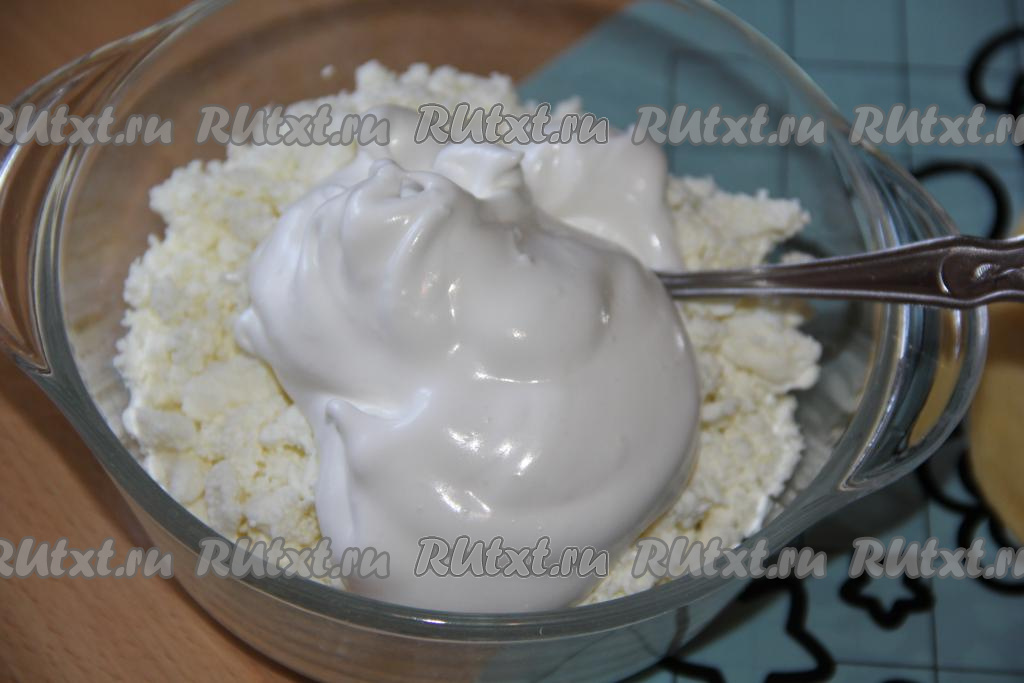 Взбитые белки добавить в творог.