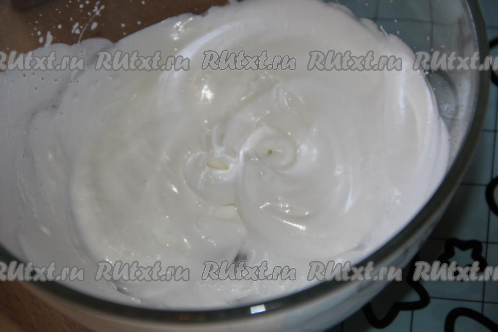 Для приготовления начинки взбить охлаждённый белок с сахаром и ванильным сахаром до стойких пиков.