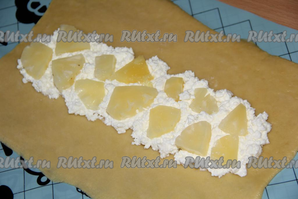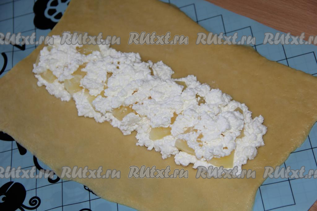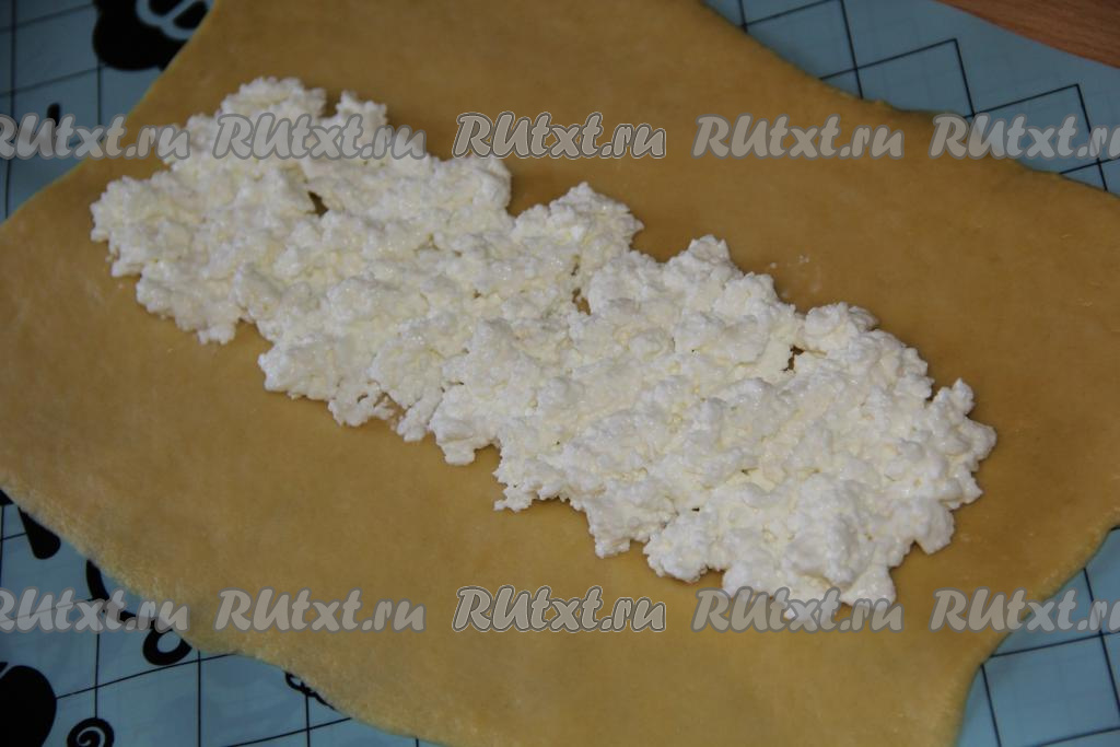 На середину одного пласта выложить часть творога в виде полоски (как на фото).