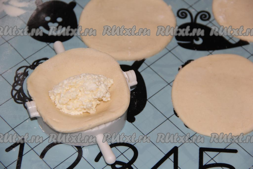 На середину каждого кружка выложить творожную начинку. Я делала крупные вареники и на каждый кружок выкладывала по 1 столовой ложке начинки.