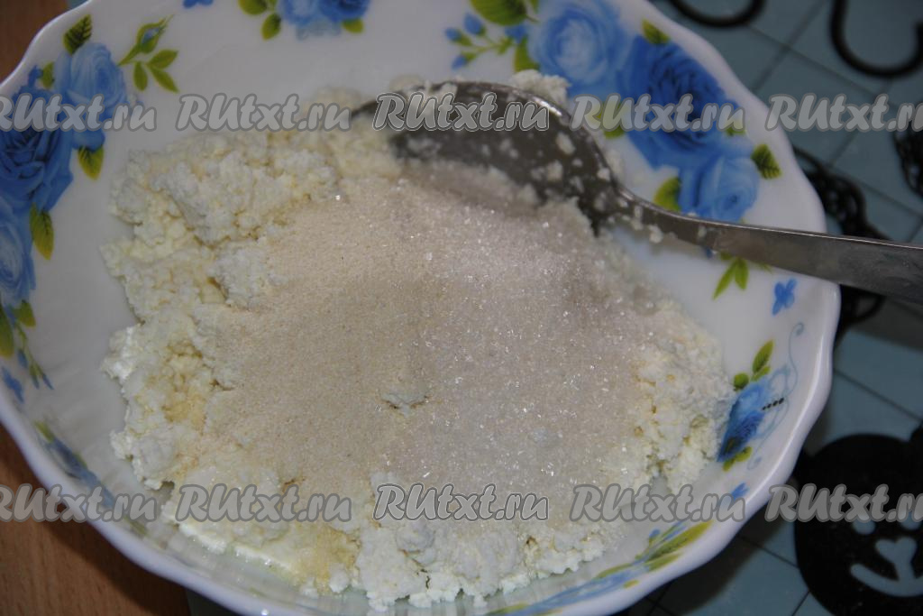 Для приготовления начинки соединить творог с сахаром. Кстати, из такого теста можно приготовить вареники и с солёным творогом.
