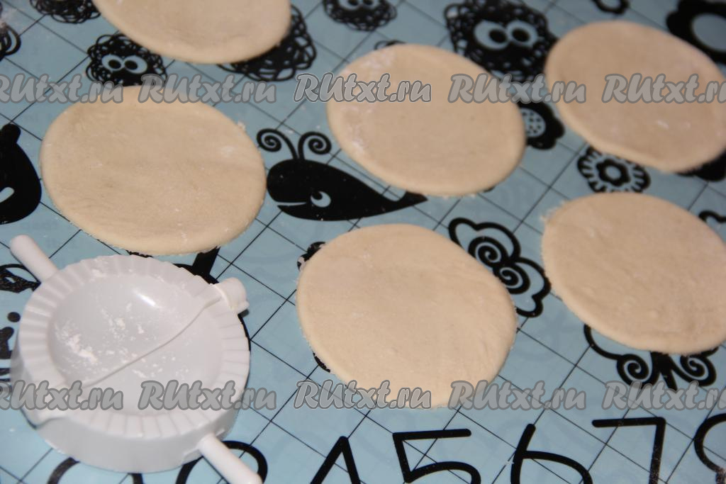 На припыленном мукой столе (или на силиконовом коврике) скалкой тонко раскатать тесто и вырезать стаканом кружочки. Вареники можно слепить, как обычно, руками, я решила сформировать вареники с помощью формочки.