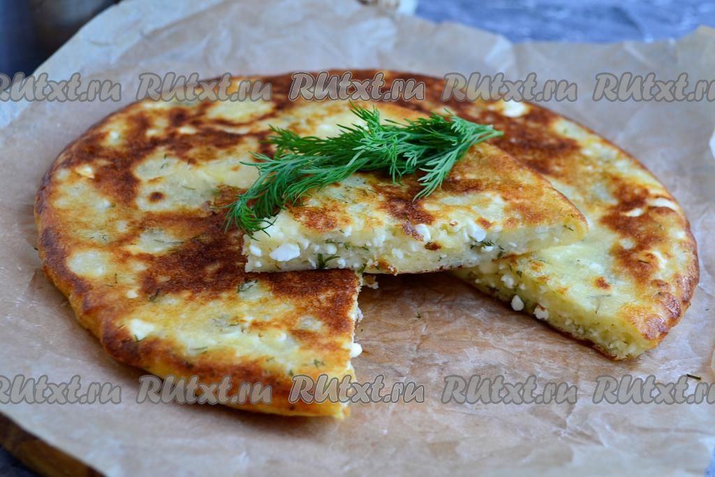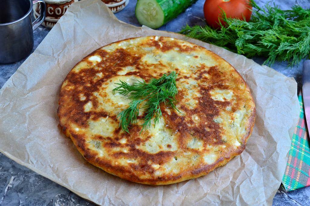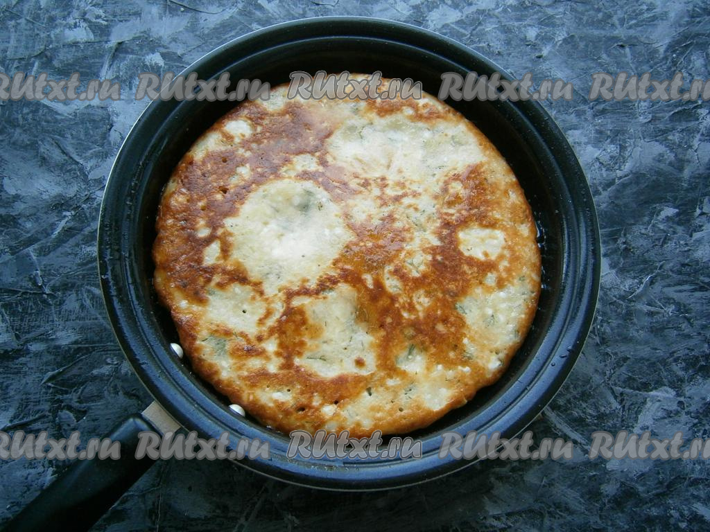 Накрыть сковороду крышкой, готовить ленивое хачапури на небольшом огне до золотистости снизу (минуты 4-5). Верх лепешки за это время должен обсохнуть.