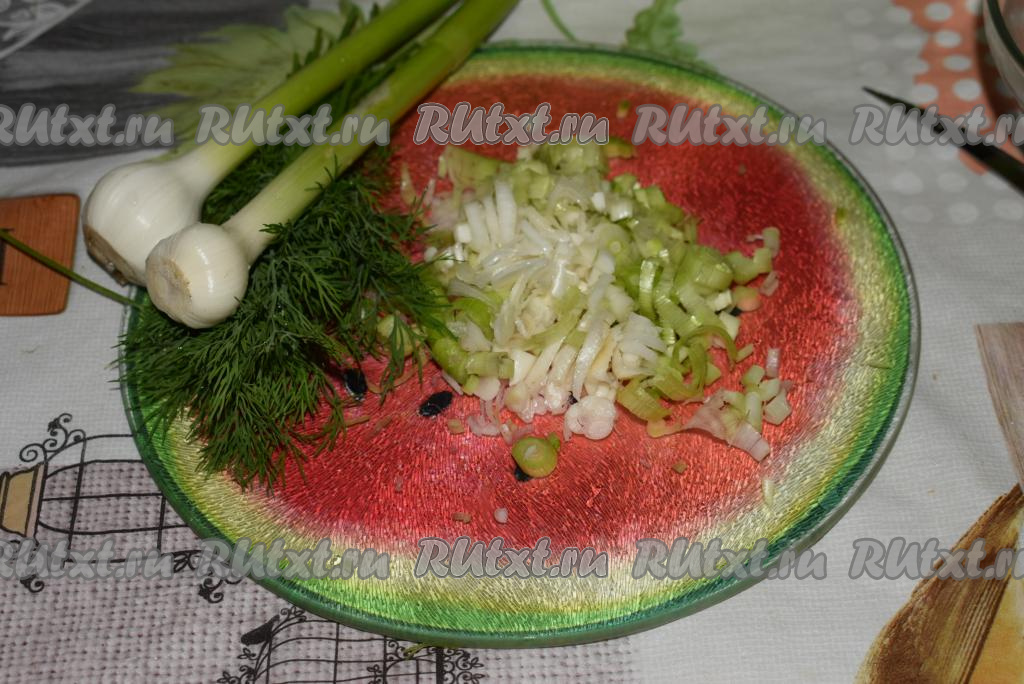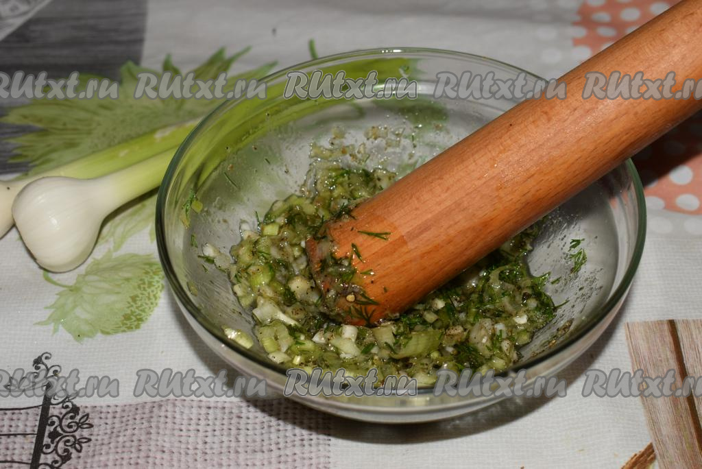 Далее готовим ароматный чесночный соус. Я приготовила этот соус с молодым чесноком, но можно взять и 4-5 зубчиков старого чеснока. Молодой чеснок вместе со стеблями нарезаем мелко (или пропускаем через пресс очищенные зубчики чеснока), добавляем мелко нарезанный укроп (можно взять и другую зелень). Немного укропа оставьте, он нам понадобится для подачи.