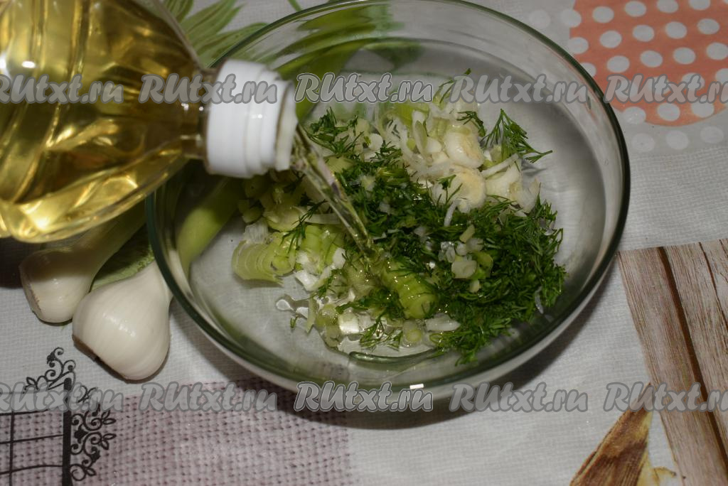 Складываем зелень с чесноком в пиалу, добавляем 2 столовые ложки растительного масла.