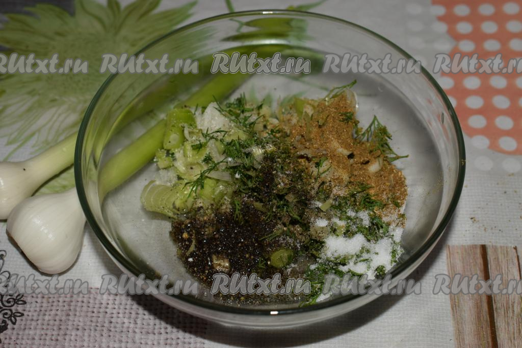 К маслу с зеленью и чесноком добавляем черный молотый перец, специи, соль и перемешиваем.