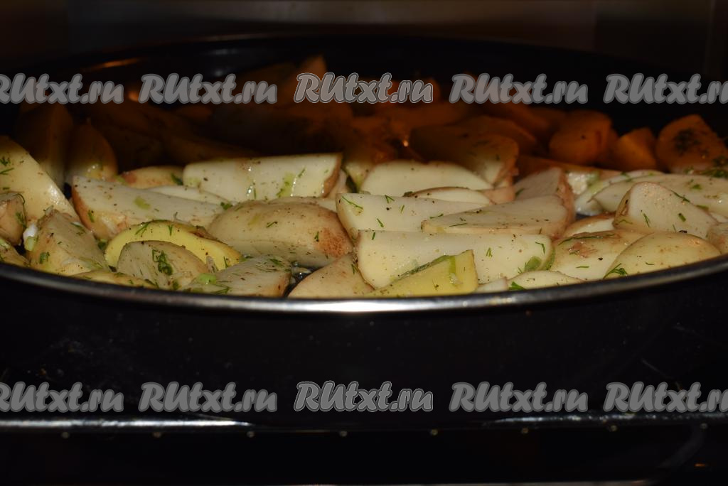 Отправляем противень с картошкой в духовку еще на 25-30 минут. Время приготовления конечно же будет различным, так как размер картофельных долек и сорт молодой картошки у всех разные. Мои дольки запекались 1 час и только после этого времени стали мягкими внутри, а корочка к этому времени стала румяной и очень аппетитной.
