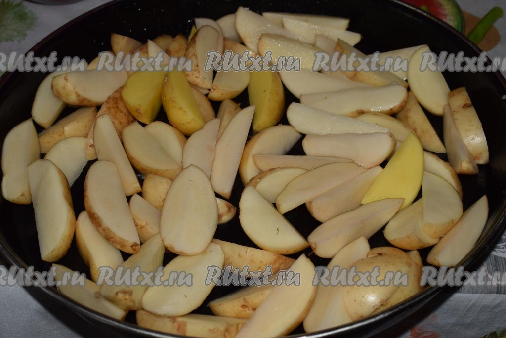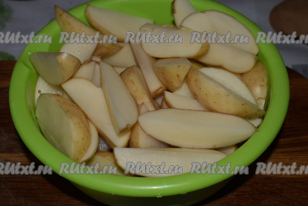Чистый картофель нарезаем на крупные дольки (если картошка мелкая, то можно разрезать на две половинки).