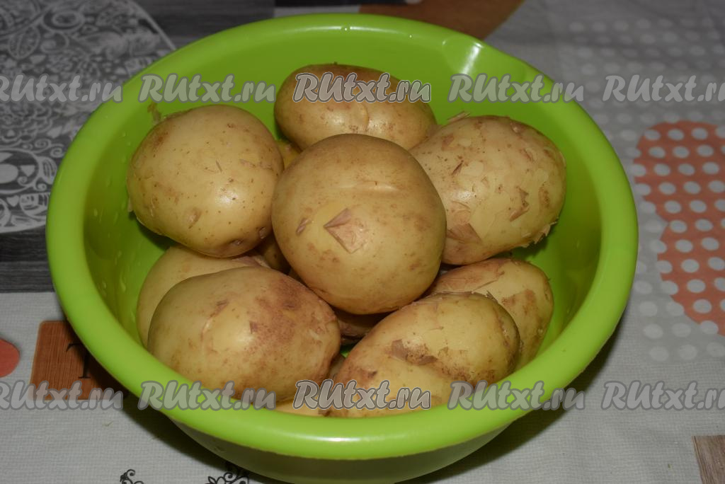Молодой картофель замачиваем на 5-10 минут в теплой воде, для того чтобы вся грязь и земля легко отошли от клубней. Промываем картошку, не счищая шкурку.