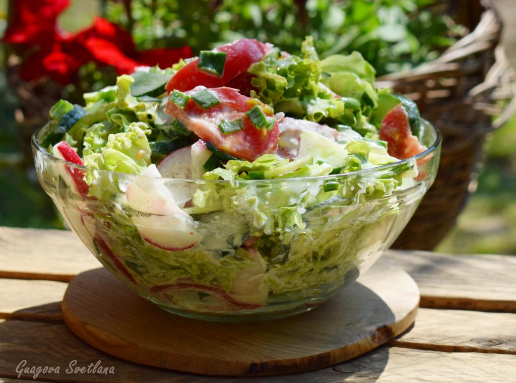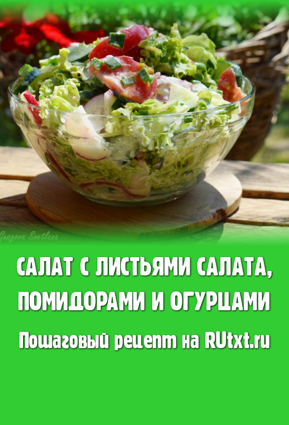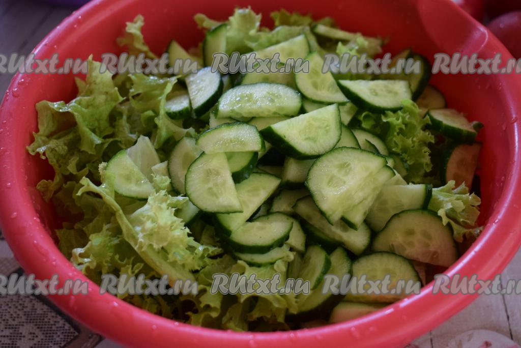 Яркий, сочный салат с помидорами, огурцами и листьями салата станет прекрасным дополнением к обеду или ужину. Такой салатик не только вкусен, но еще и невероятно полезен, поэтому обязательно включите его в рацион питания вашей семьи. В зависимости от сезона к такому салату можно добавить любую доступную зелень и сезонные овощи.