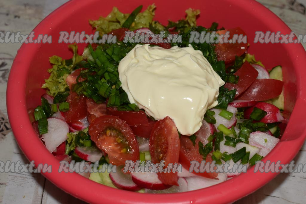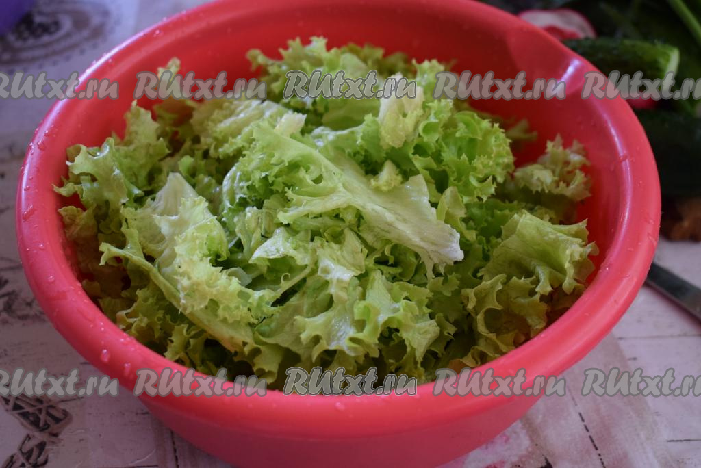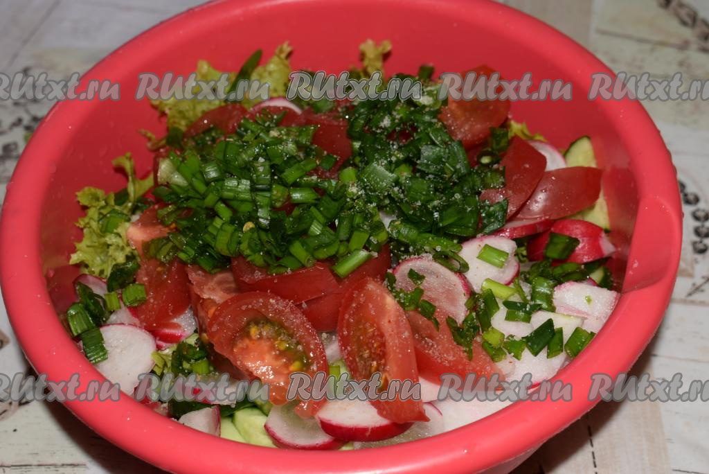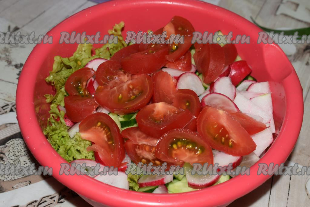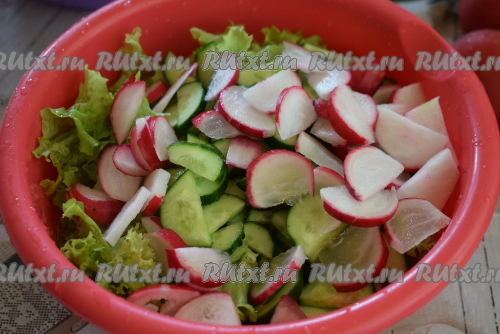 Редис нарезаем кружочками (или полукружочками) и добавляем в салат из огурцов и листьев салата.