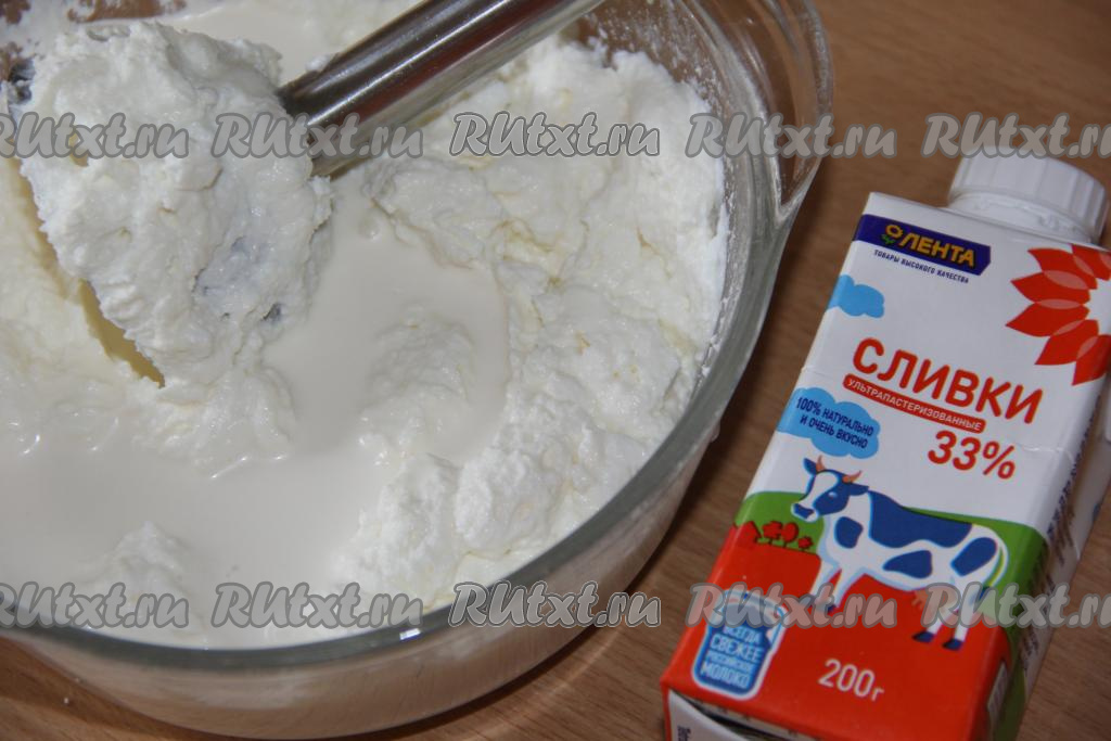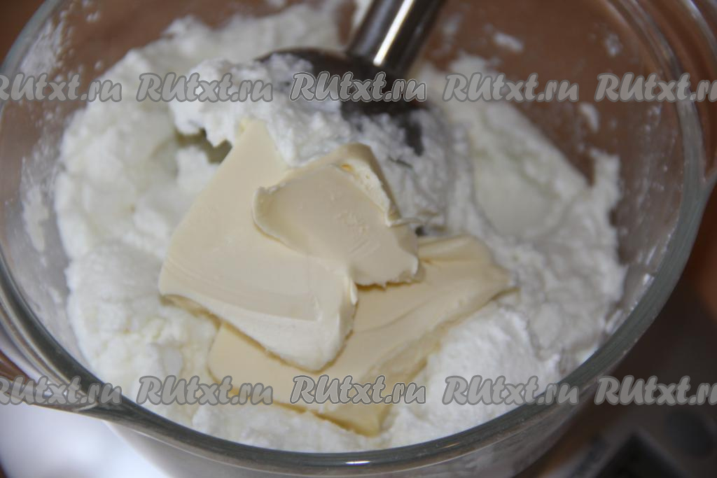 Заранее достаньте сливочное масло из холодильника, чтобы оно стало мягким. Соединить творог и сахарную пудру (можно взять сахар мелкого помола). Творог лучше брать пожирнее, я использовала творог жирностью 9%. Пробить творог с сахарной пудрой погружным блендером до однородного состояния.