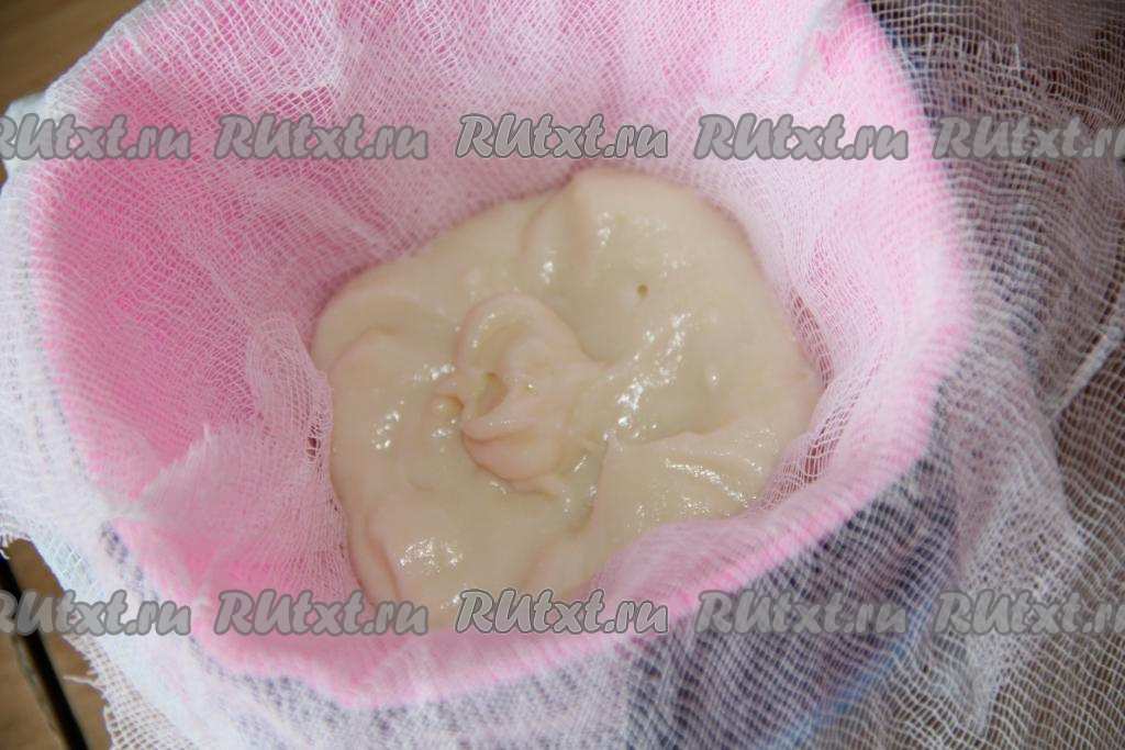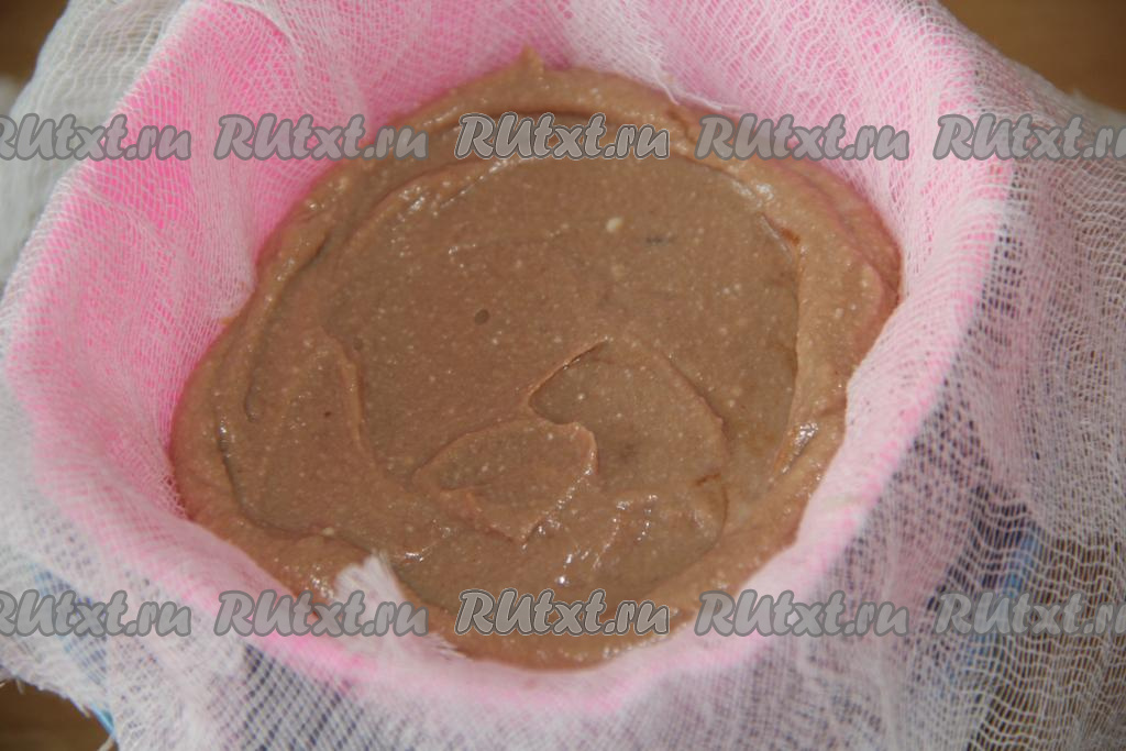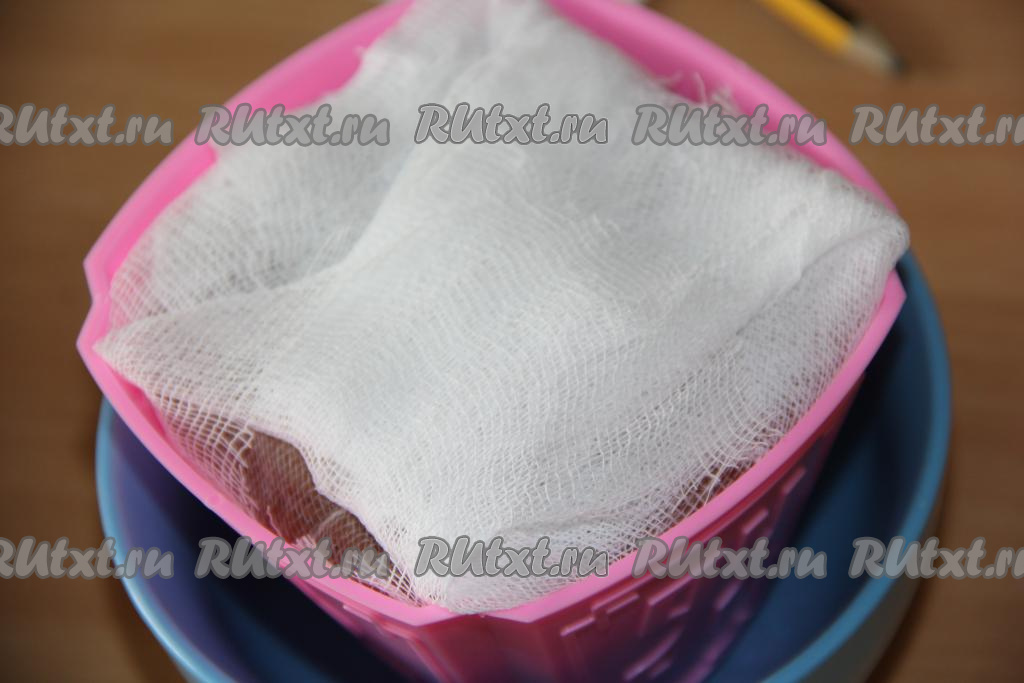 Накрыть массу свисающими краями марли. Сверху поставить блюдце и груз. Убрать форму в холодильник на 12-15 часов. Периодически в миску, в которой стоит форма, из творожной массы будет выделяться жидкость, которую нужно сливать.