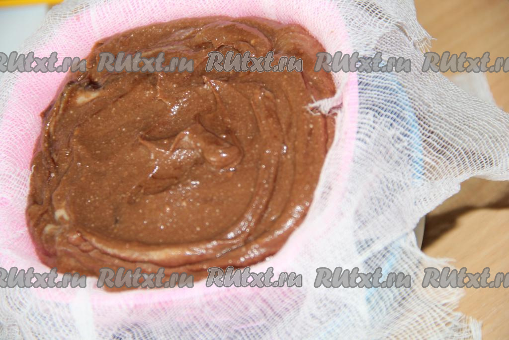 Форму для пасхи выстелить марлей, сложенной вдвое (концы марли должны свисать с краёв формы). Выложить в форму массу с белым шоколадом. Поставить форму в миску и отправить в холодильник минут на 15. Пока первый слой охлаждается, приготовить следующий слой.