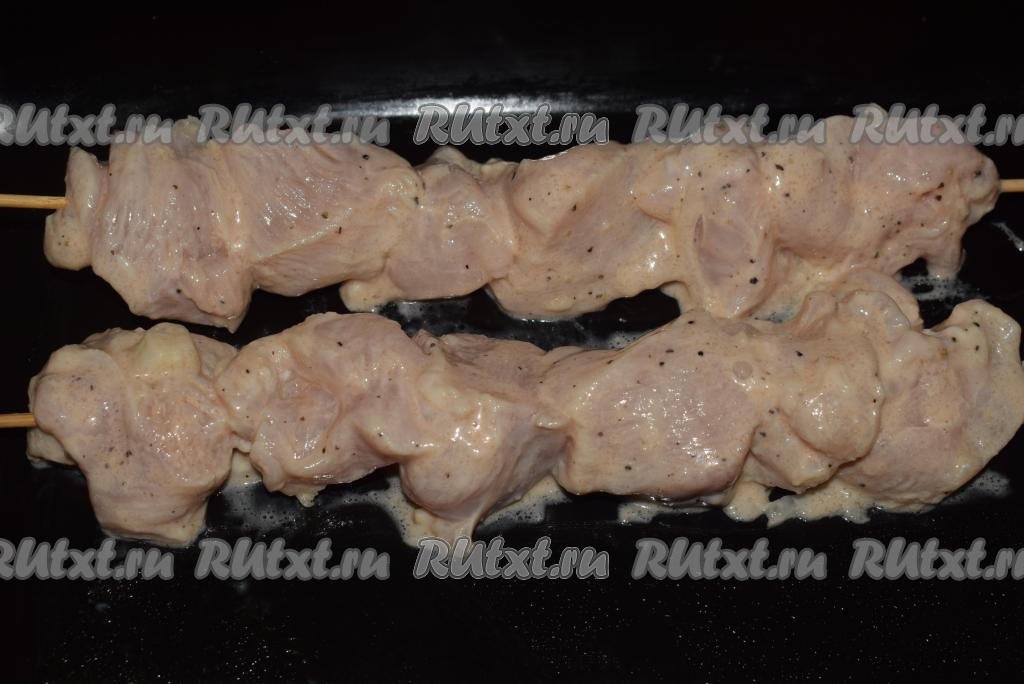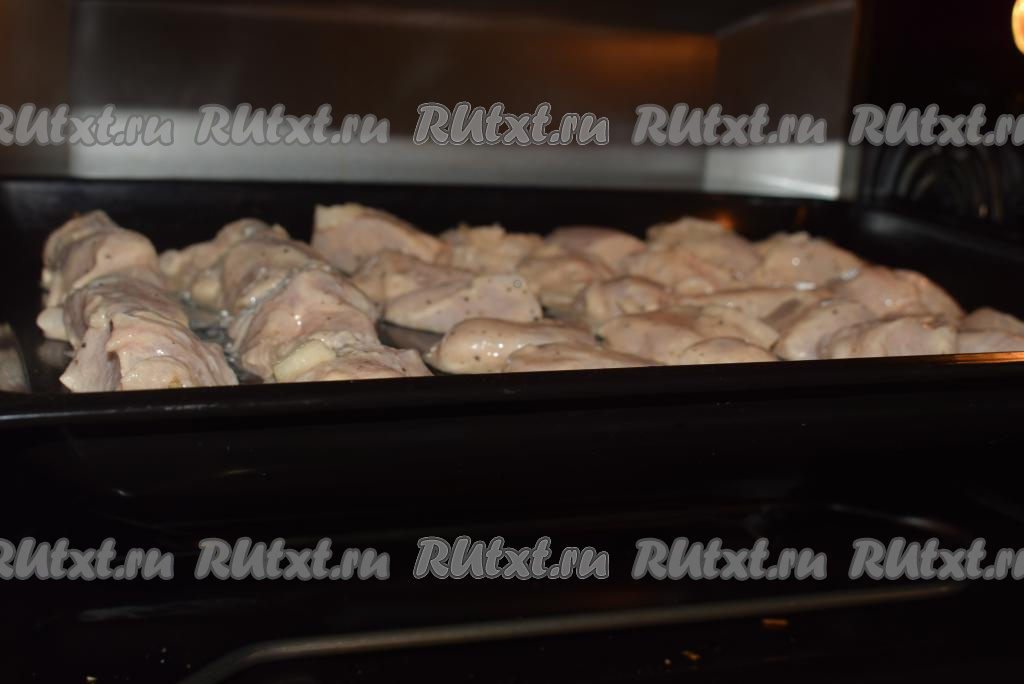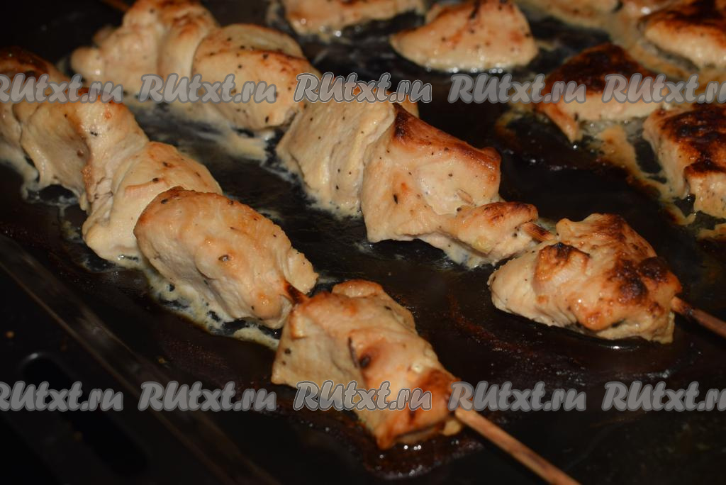 Отправляем противень с шашлыками из куриного филе в разогретую духовку и запекаем при температуре 190-200 градусов, примерно, 30 минут.