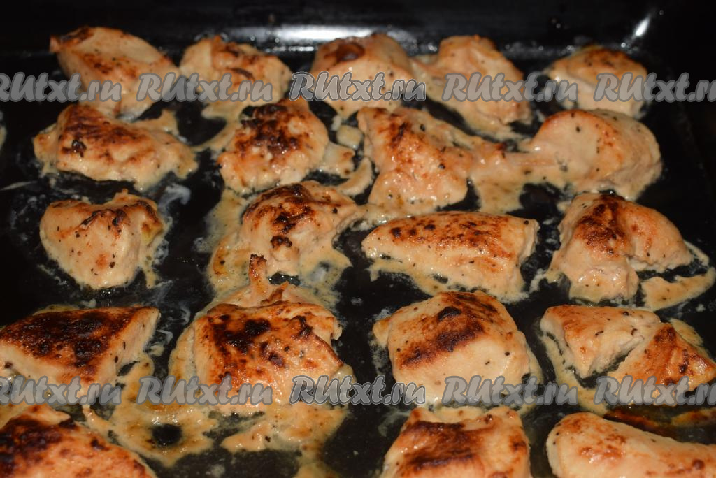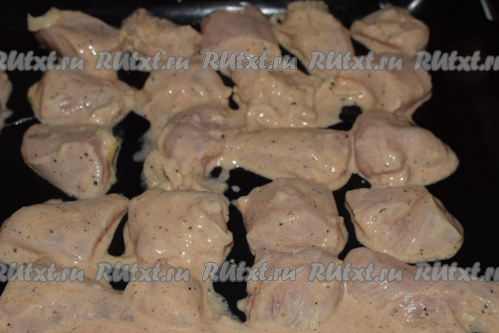 А можно просто выложить кусочки куриного шашлыка на противень. При желании, на противень можно выложить и лук, с которым мариновалось мясо. Запеченный лук получится очень вкусным.