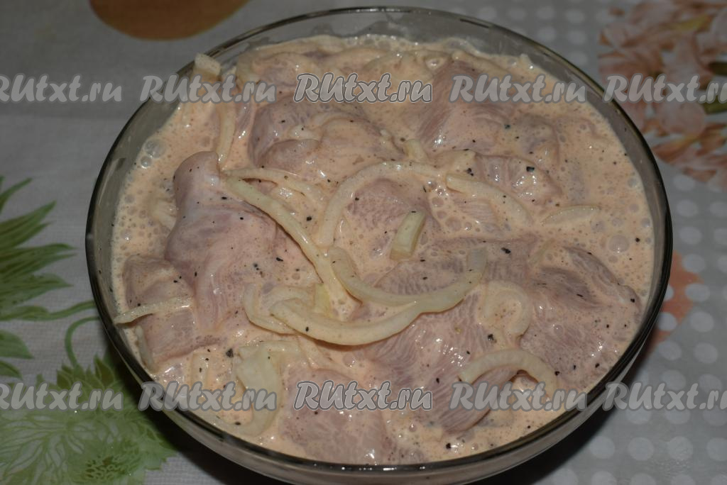 Маринад добавляем к куриному филе с луком и тщательно перемешиваем, равномерно распределяя маринад между кусочками мяса.