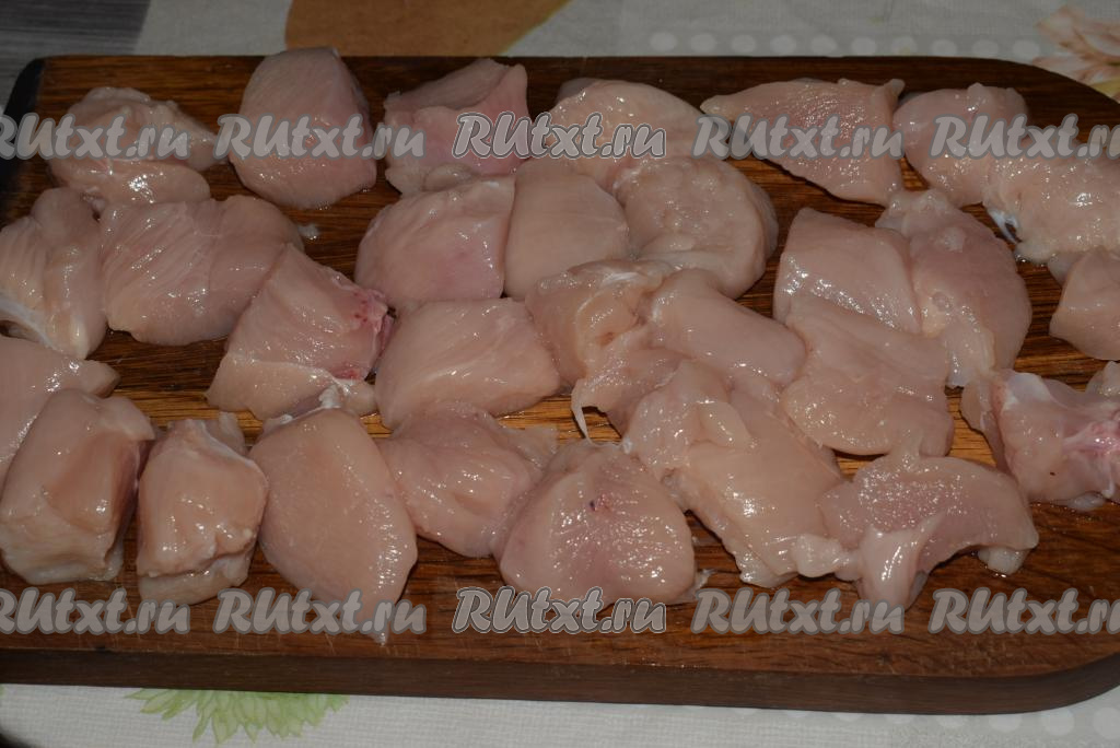 Далее нарезаем филе на средние кусочки, примерно, равные по размеру и складываем в глубокую миску.