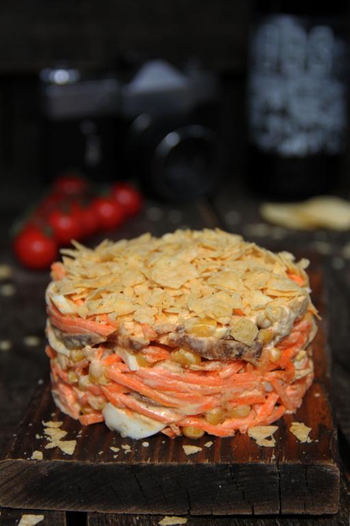 Снять бортики и присыпать салат измельчёнными чипсами. Можно подать салат и в салатнике (или выложить в тарталетки), а перед подачей присыпать чипсами. Салат, приготовленный с копчёной курицей, кукурузой и корейской морковью, получается пикантным и очень вкусным, он прекрасно разнообразит меню в будни и праздники!