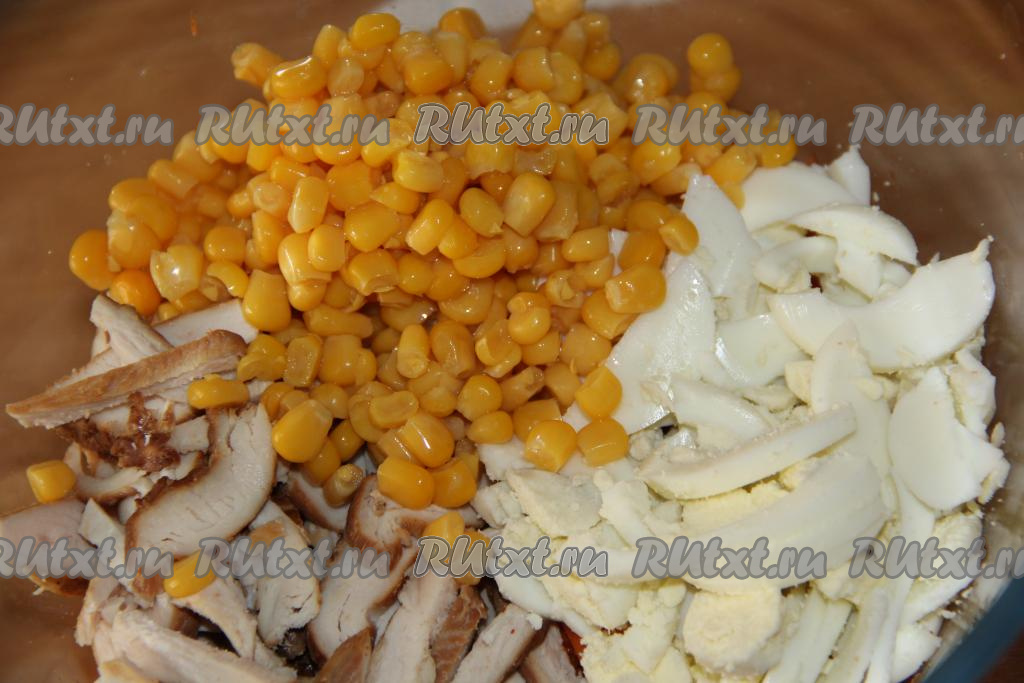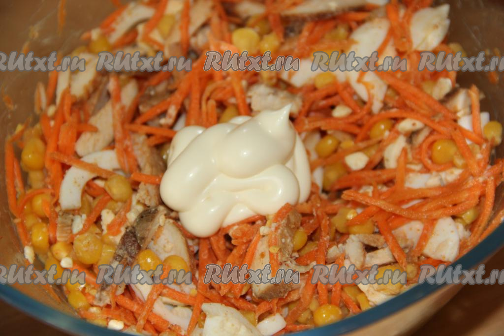 Кукурузу, предварительно слив с неё жидкость, добавить в салат из копчёной курицы, яиц и корейской моркови, перемешать.
