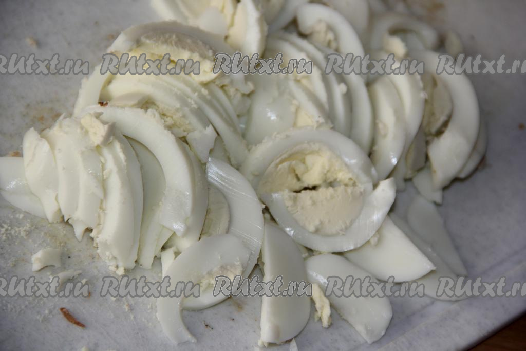 Яйца предварительно сварить (варить 10 минут с момента закипания воды), остудить, а затем очистить и нарезать длинными дольками.