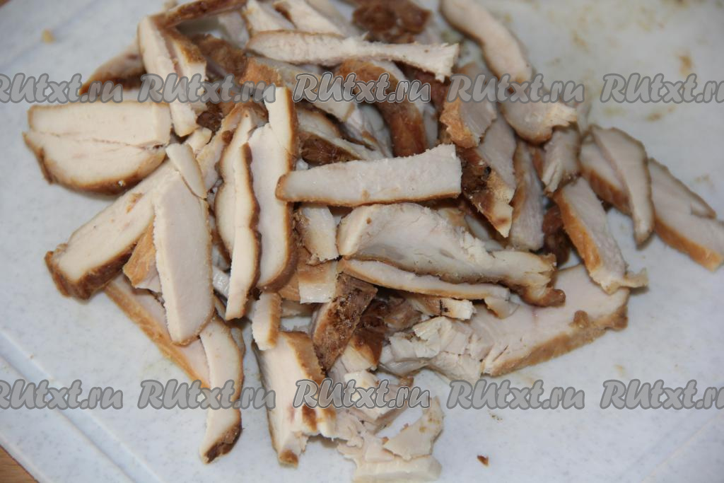 Копчёную курицу (я использовала копчёную грудку) нарезать длинными брусочками.