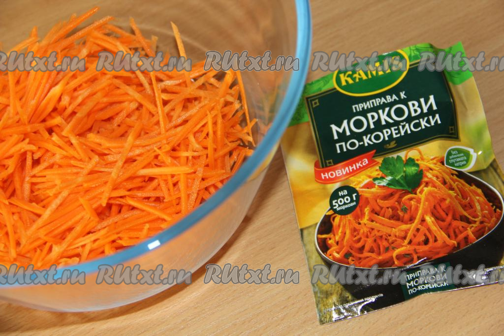 Соединить корейскую морковь с нарезанной копчёной курицей.