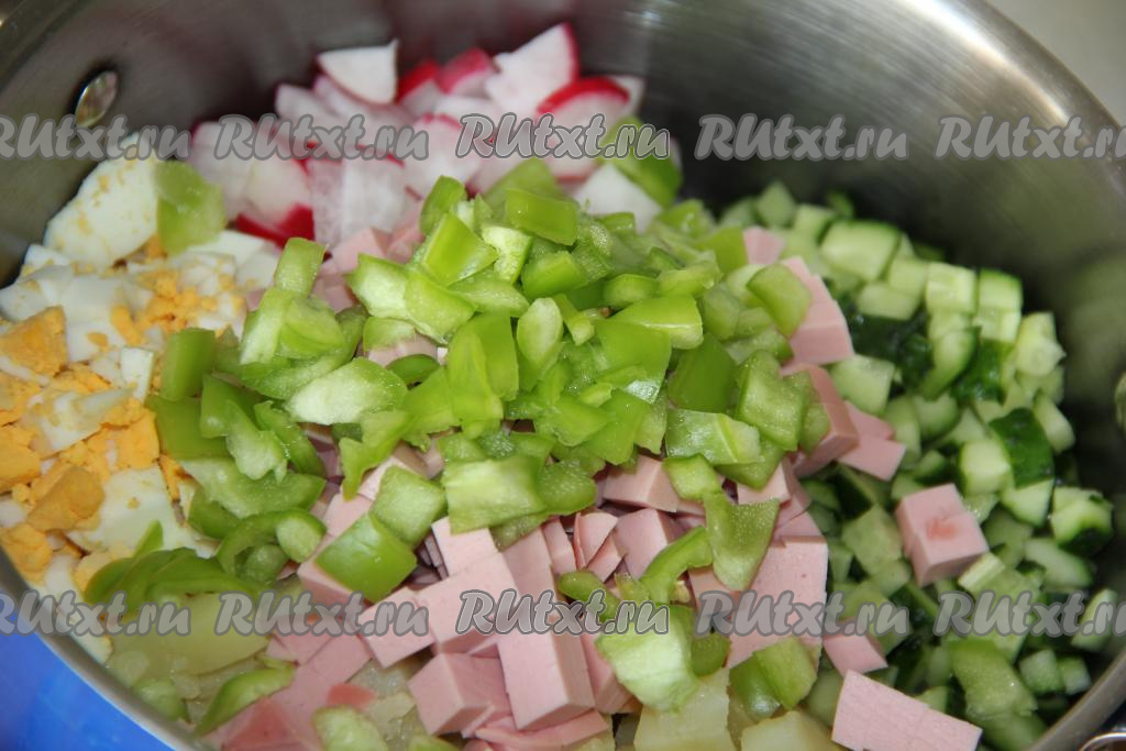 Вымыть редиску, огурцы и болгарский перец. Редис, нарезав тонкими ломтиками, добавить в кастрюлю к яйцам и картошке.