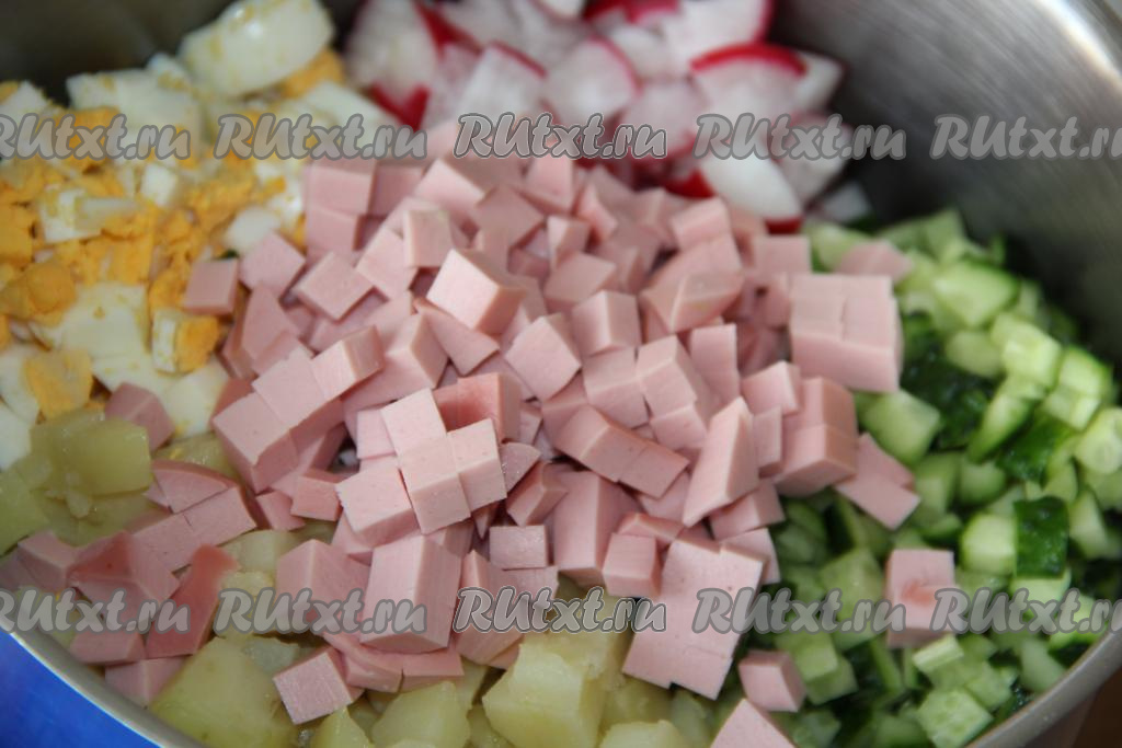 Сюда же добавить и колбасу, нарезанную средними кубиками.