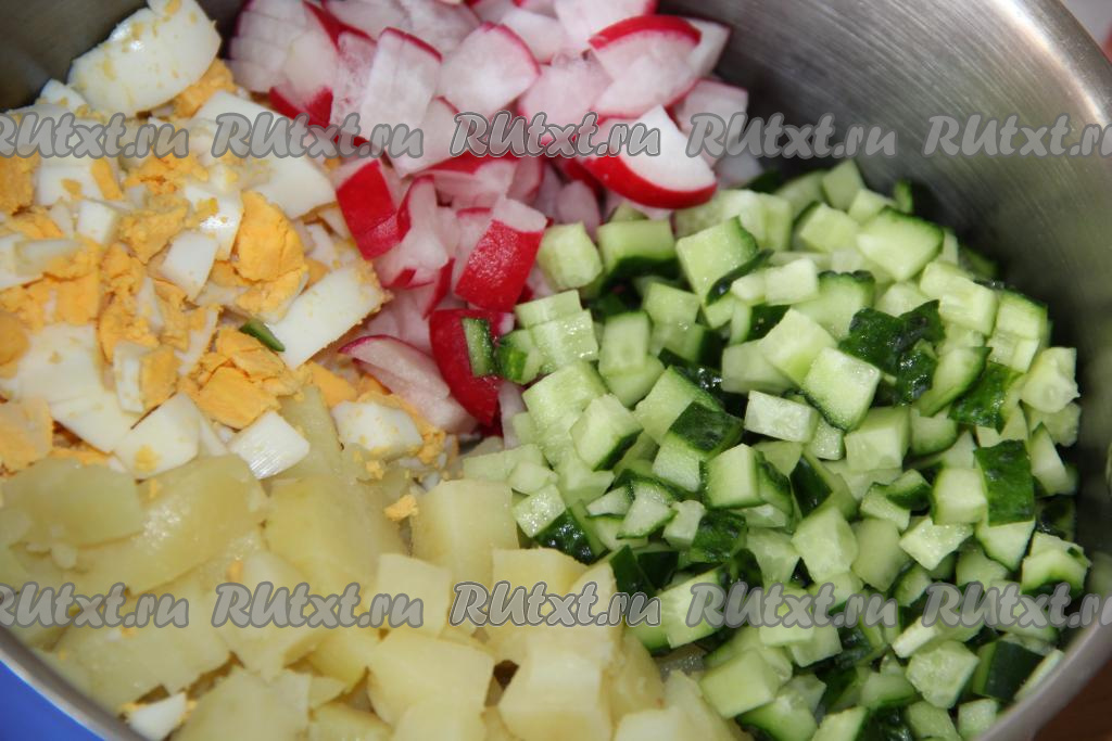 Картофель и яйца предварительно сварить, остудить и очистить. Нарезать картошку на кубики среднего размера, выложить в большую кастрюлю (или глубокий салатник).