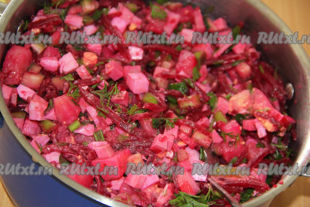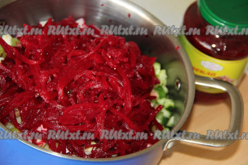 В кастрюлю к овощам, колбасе и яйцам добавить маринованную свеклу вместе с маринадом.