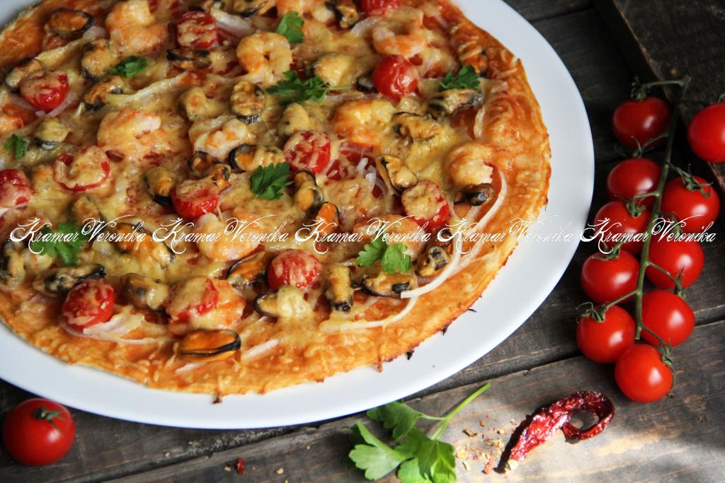 Вот такая аппетитная и очень вкусная пицца с мидиями и креветками получилась. Вторую пиццу приготовить по тому же принципу.
