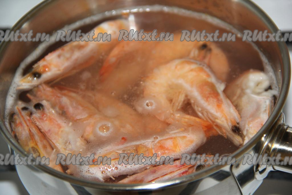 В другой кастрюле тоже вскипятить воду, выложить креветки, после закипания уменьшить огонь и варить их 2-3 минуты. Отваренные креветки откинуть на дуршлаг, остудить и очистить.