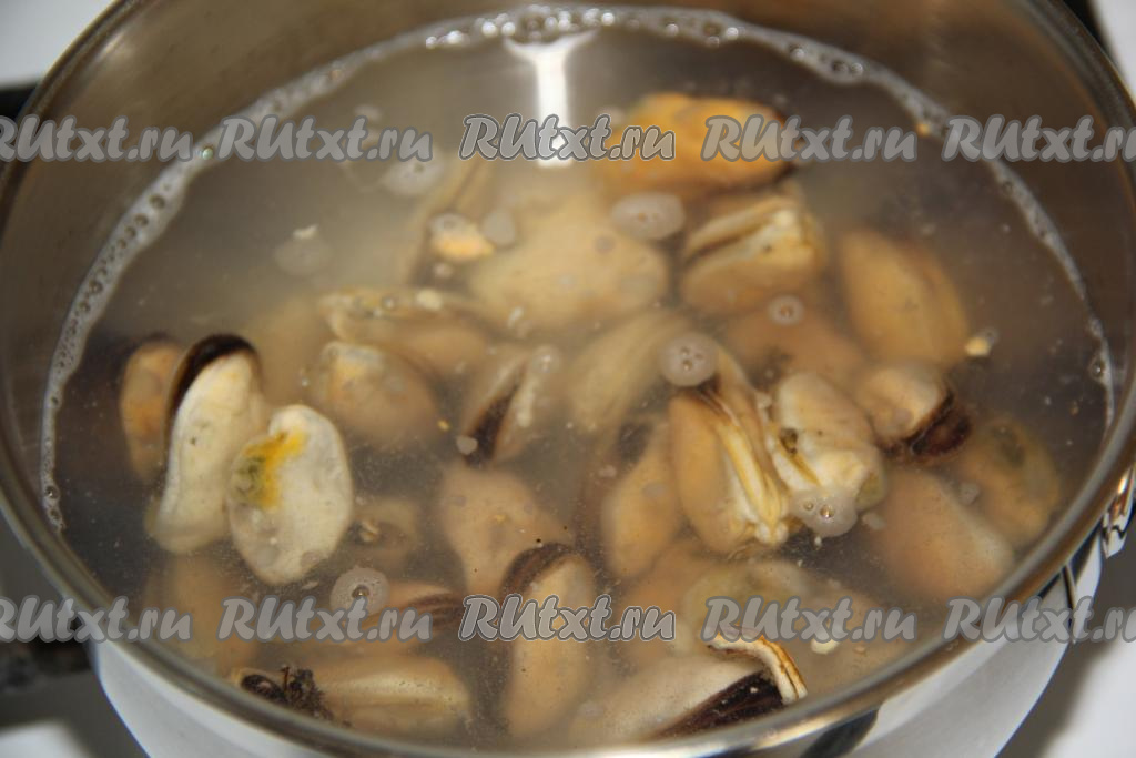 Пока тесто подходит, отварим морепродукты. Для этого в одной кастрюле нужно вскипятить воду, выложить мидии и отварить их в течение 5 минут с момента закипания на небольшом огне. Затем откинуть мидии на дуршлаг и дать остыть.