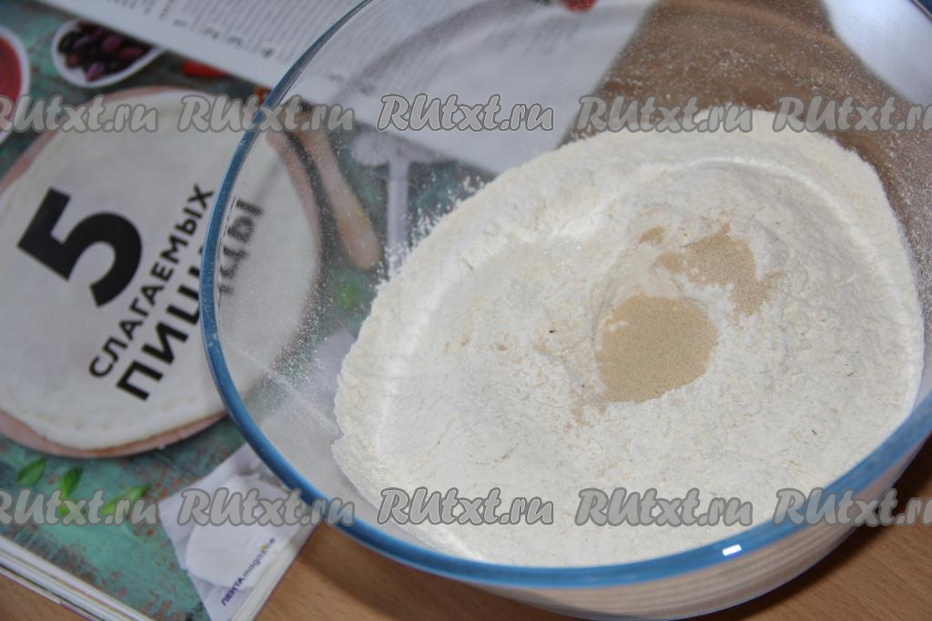 В муку, просеянную в глубокую миску, всыпать дрожжи, соль и сахар. Хорошо перемешать сухие ингредиенты, затем влить масло и воду. Воду нужно использовать тёплую, примерно, 39 градусов.