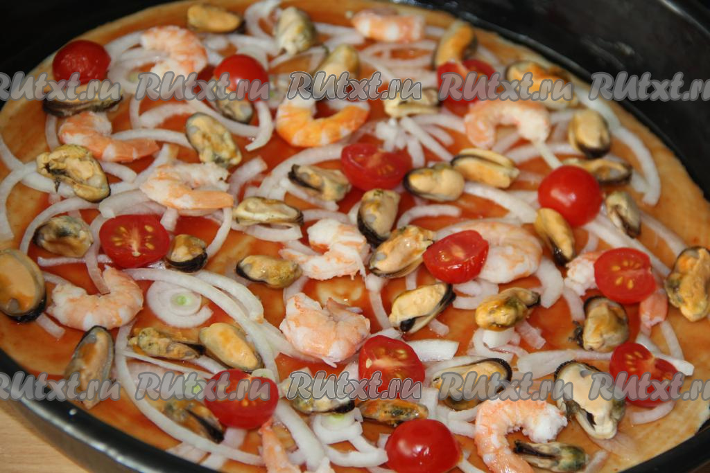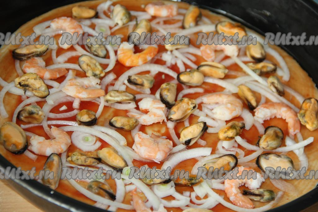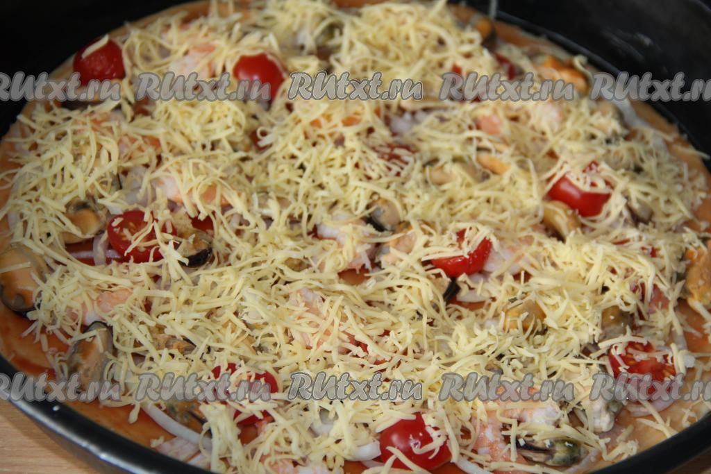 Пиццу щедро посыпать натёртым сыром и отправить в разогретую духовку. Выпекать пиццу с морепродуктами минут 8-10 при температуре 220 градусов.