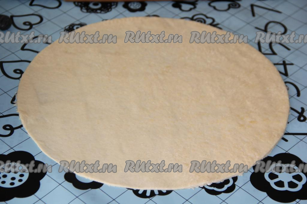 По прошествии 1-1,5 часов дрожжевое тесто хорошо поднимется, его нужно обмять и разделить на две части (в итоге у нас получатся две пиццы с морепродуктами). Оставить тесто на столе под полотенцем на 15 минут. Затем одну часть теста раскатать в тонкий круг. Я раскатала тонко тесто, а затем вырезала ножом ровный круг, используя тарелку.