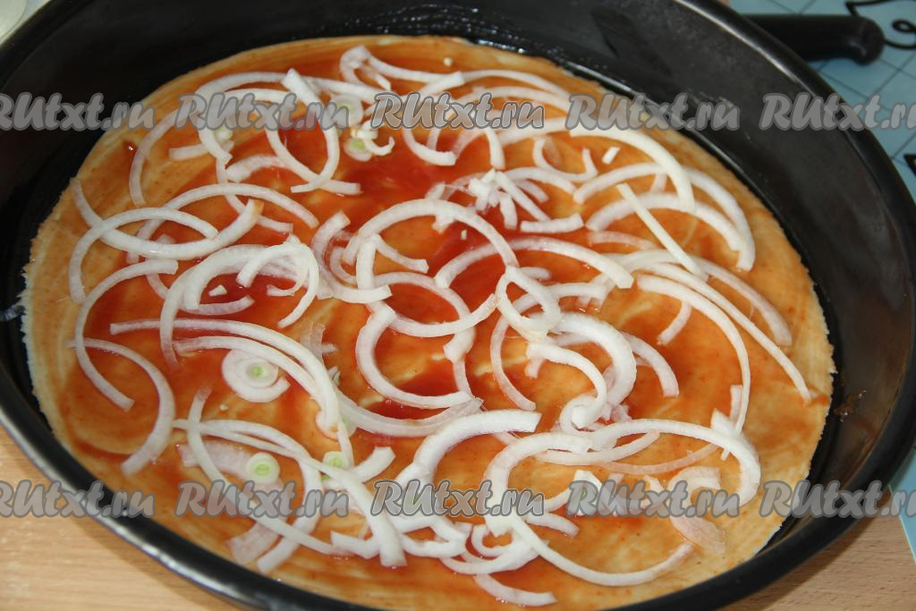 Смазать форму для выпечки растительным маслом, выложить раскатанное тесто, хорошо смазать томатным соусом (или кетчупом).