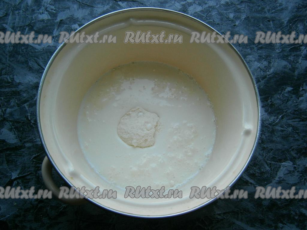Оставшиеся 350 мл молока налить в толстостенную кастрюлю, всыпать смесь сухого молока и сахара, добавить молочно-крахмальную смесь.