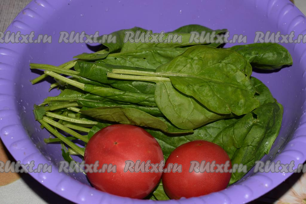 Шпинат и помидоры промываем водой, обсушиваем, чтобы избавиться от лишней влаги.