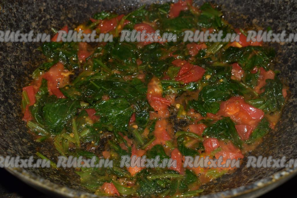 Готовые шпинат с помидорами пустят сок и станут похожи на зажарку (как на фото).