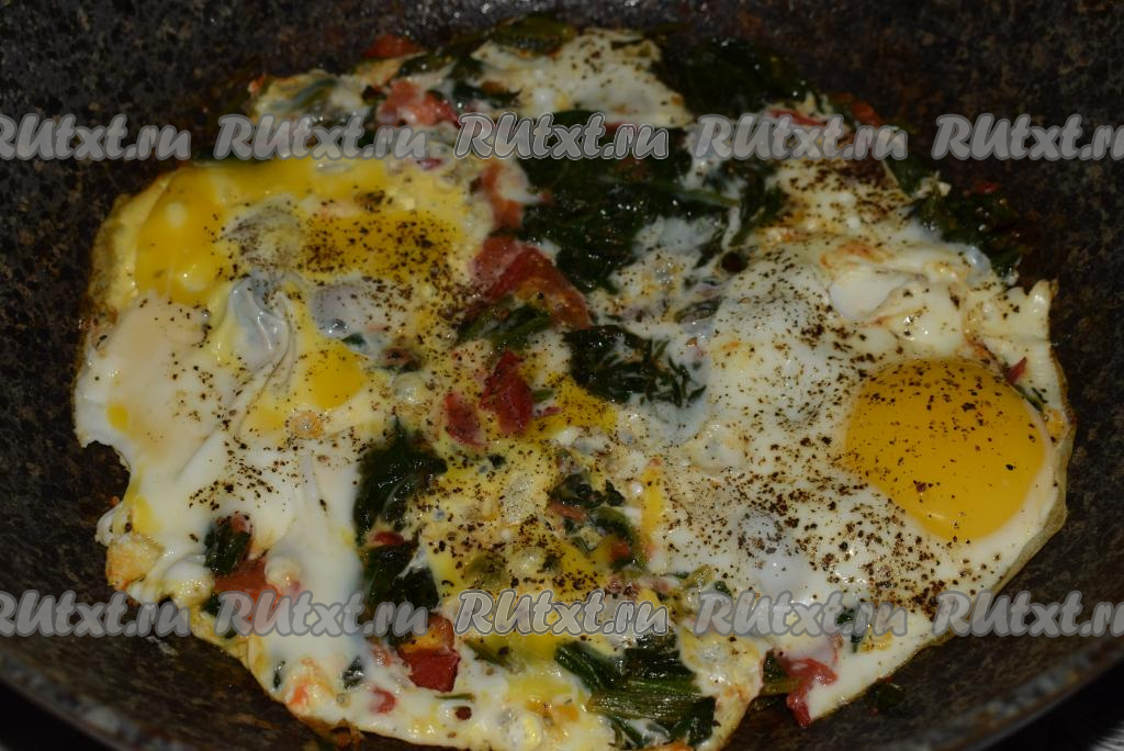 Затем к обжаренным помидорам и шпинату вбиваем яйца, слегка солим и перчим. Готовим яичницу на небольшом огне 2-3 минуты (белок должен полностью свернуться, а желток - остаться жидким).